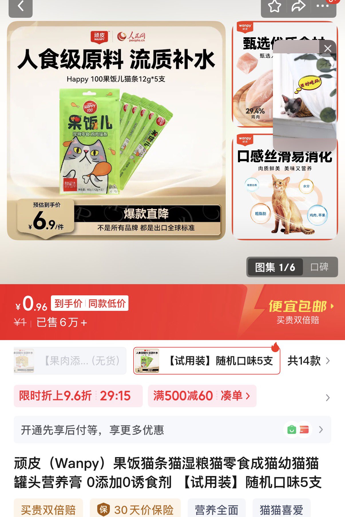 顽皮(Wanpy)果饭猫条猫湿粮猫零食成猫幼猫猫罐头营养膏 0添加0诱食剂 【试用装】随机口味5支