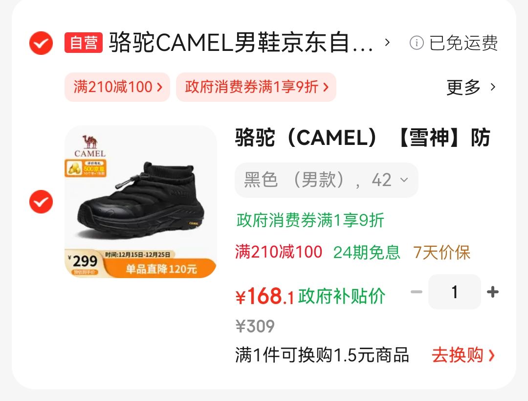 骆驼(CAMEL)【雪神】防泼水抓地保暖户外徒步雪地靴男 G15W342004 黑色 42
