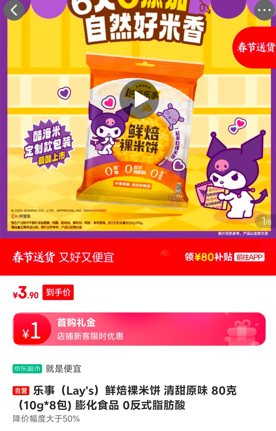 乐事(Lay's)鲜焙裸米饼 清甜原味 80克(10g*8包) 膨化食品 0反式脂肪酸
