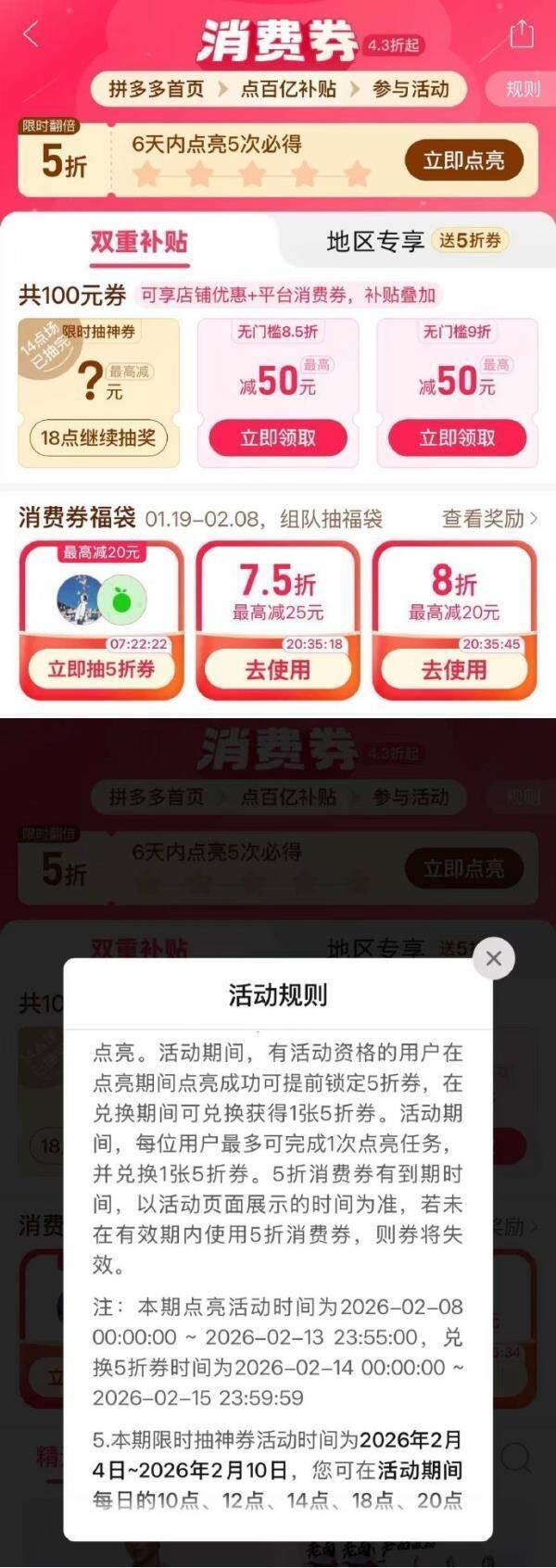 5折券新一轮点亮开始了,兑换时间2.14-2.15