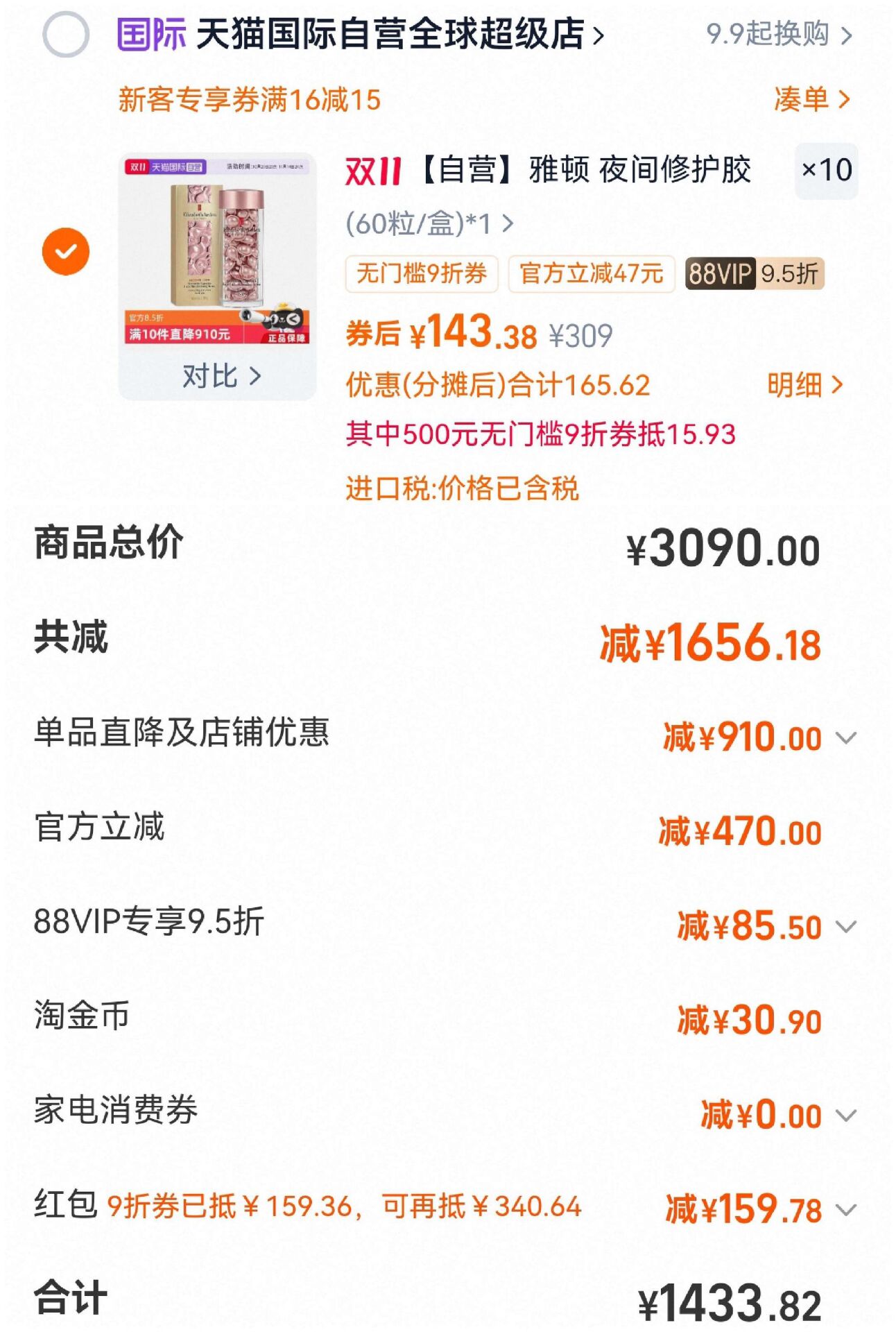 数量10,叠加淘金币 9折券