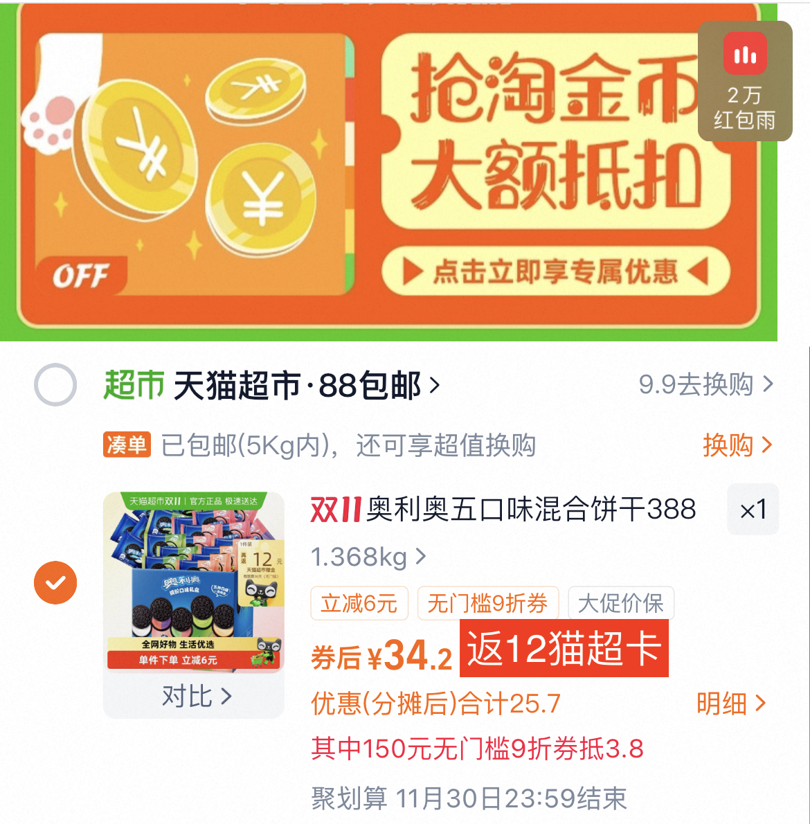 34亓-返12猫超卡=22亓,折7.3亓/盒