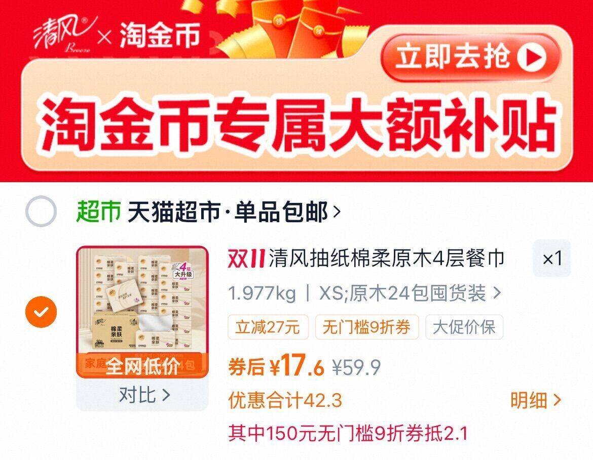 清风 原木抽纸3层100抽*24包