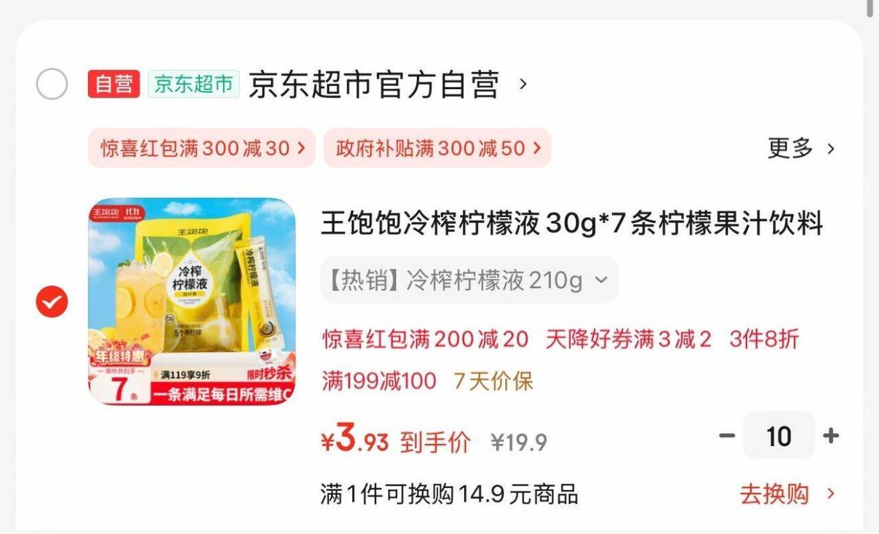 王饱饱冷榨柠檬液30g*7条,每件3.93