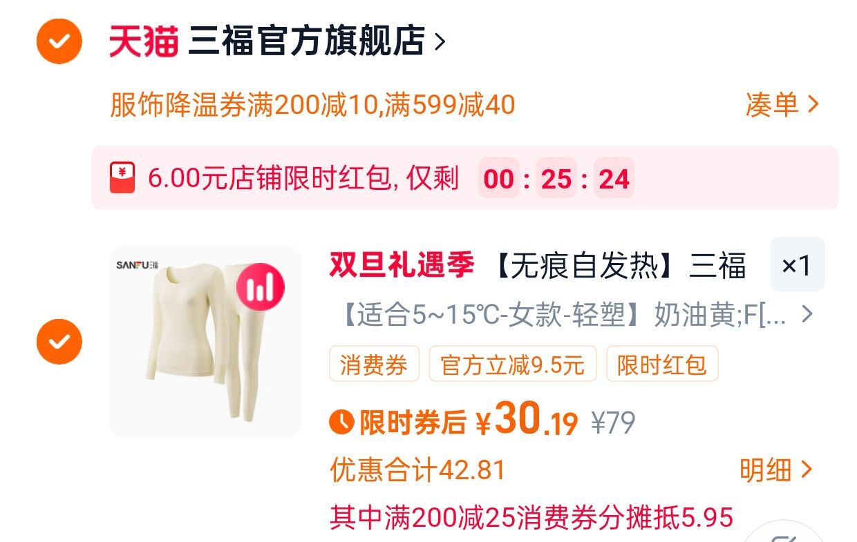 三福修身保暖衣套装到手30.19元