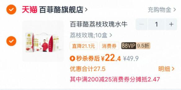 百菲酪水牛奶200ml*10盒 到手22.4元