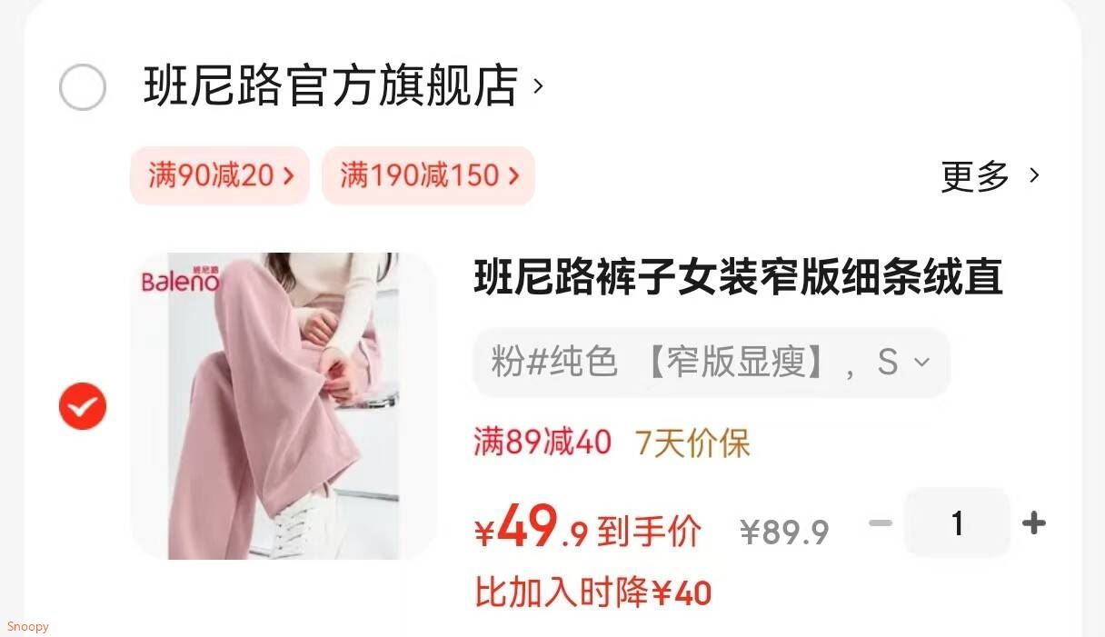 班尼路 裤子女装窄版细条绒直筒裤【49.9】