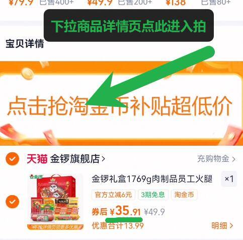 下拉详情页去淘金币拍,叠4金币