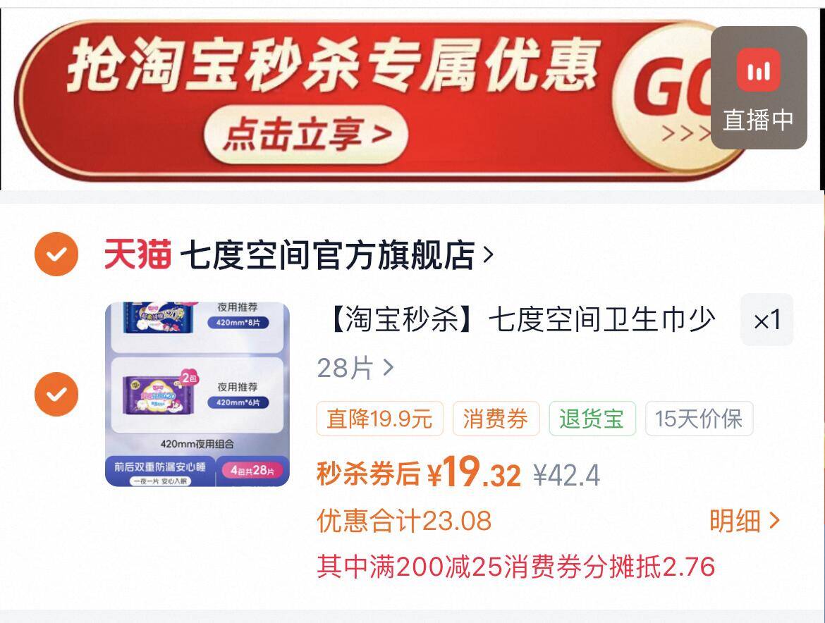 七度空间纯棉夜用卫生巾420mm*28片