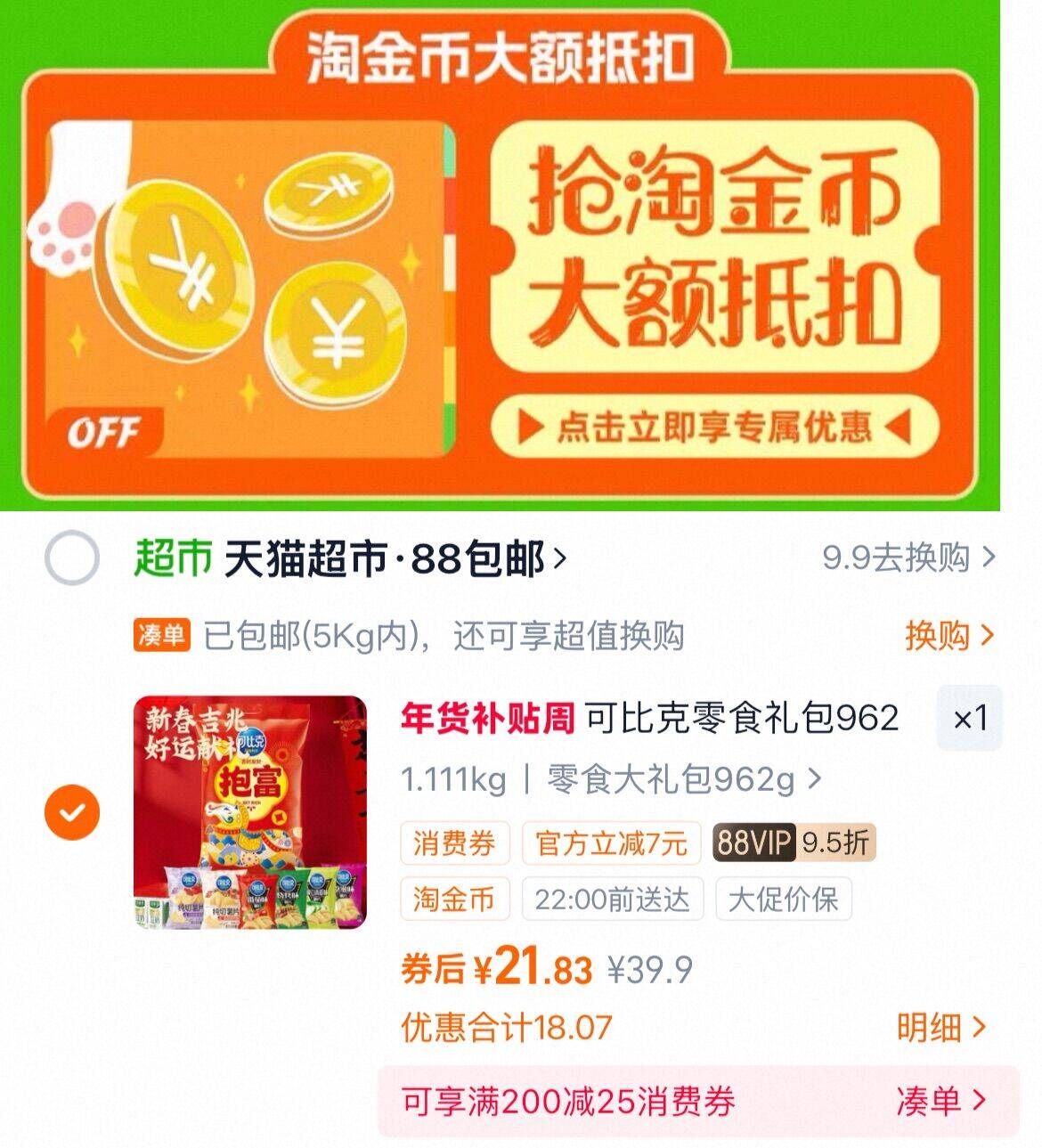 2、凑1件,用200-25消费劵