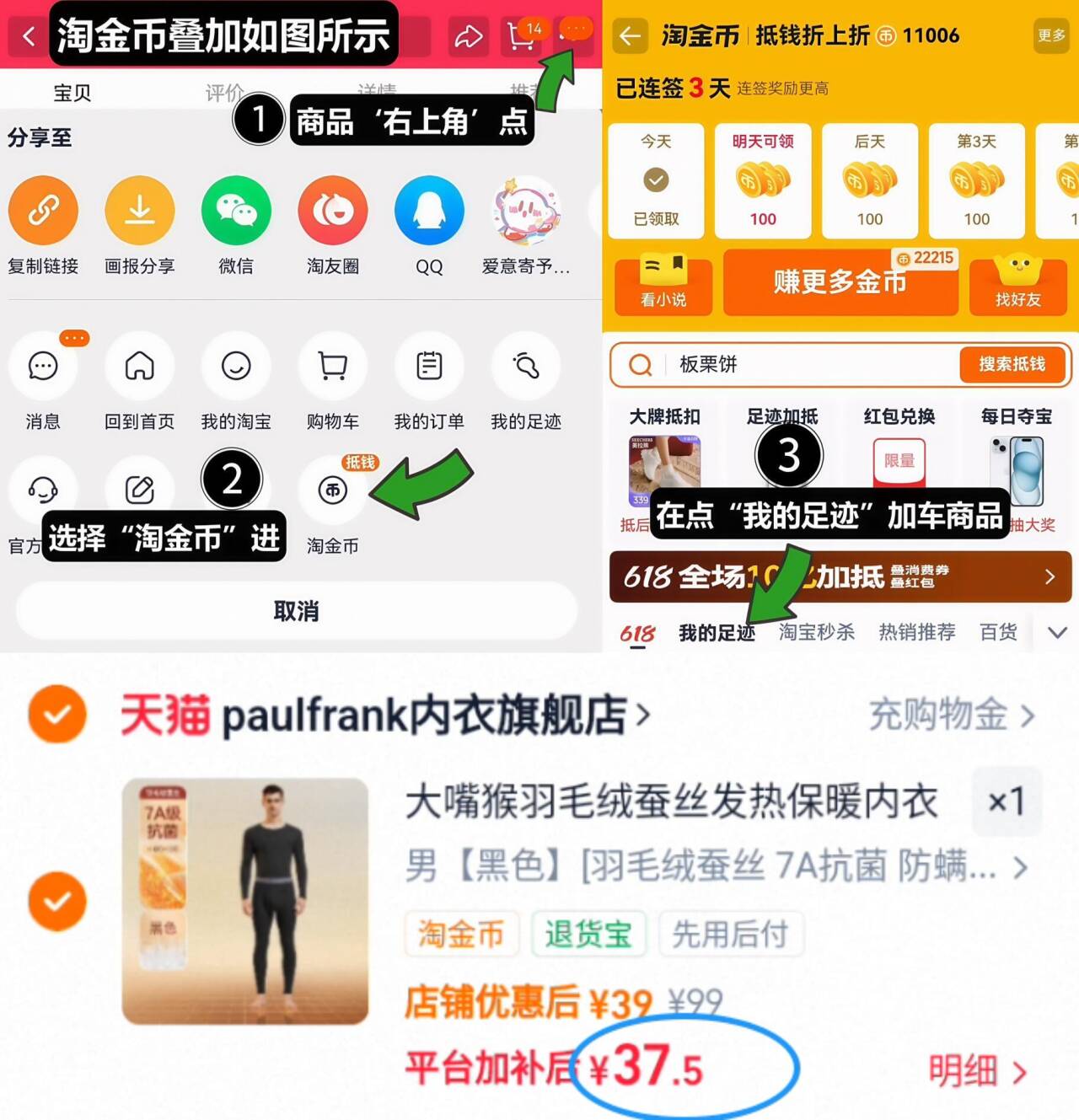 1、如图点右上角3个点,选淘金币