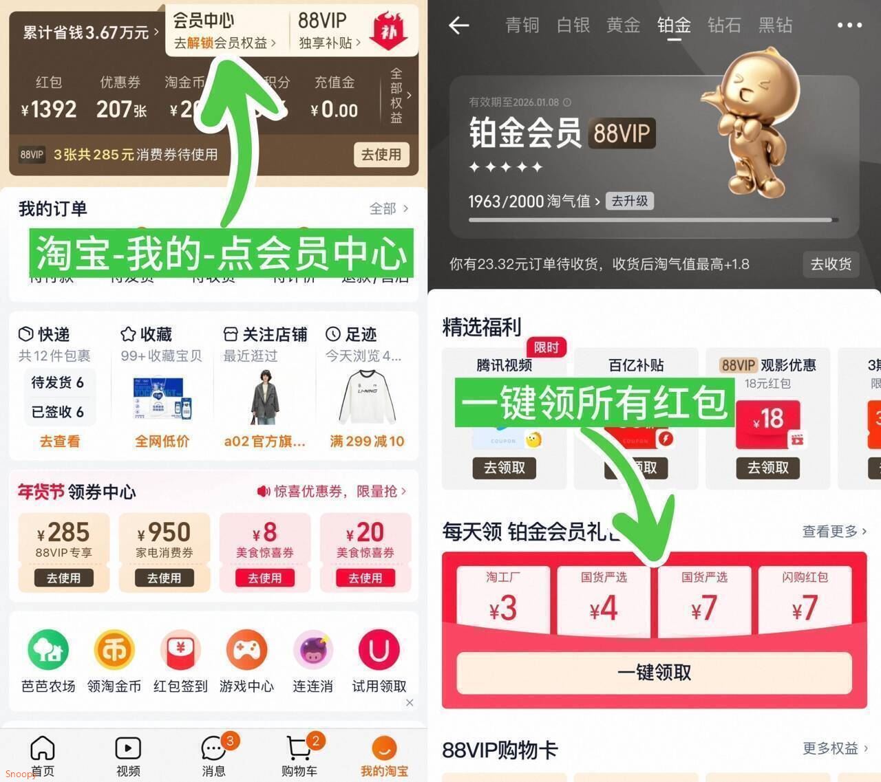 去陶宝→我的→会员中心→领虹包