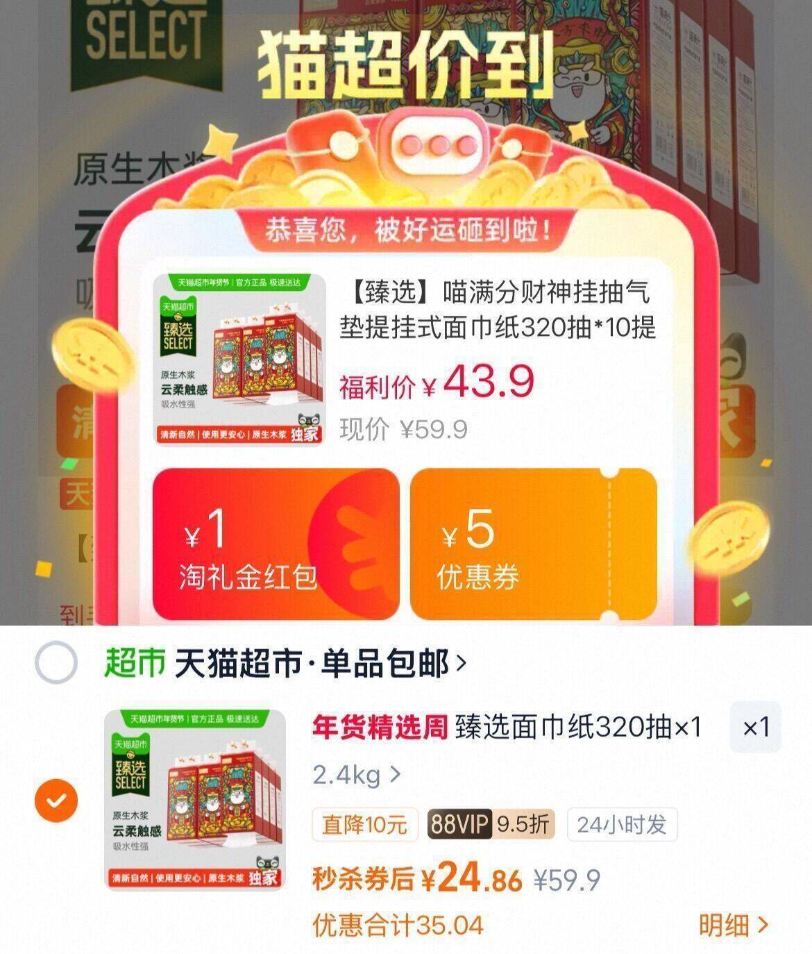 喵满分 提挂式抽纸320抽*10提