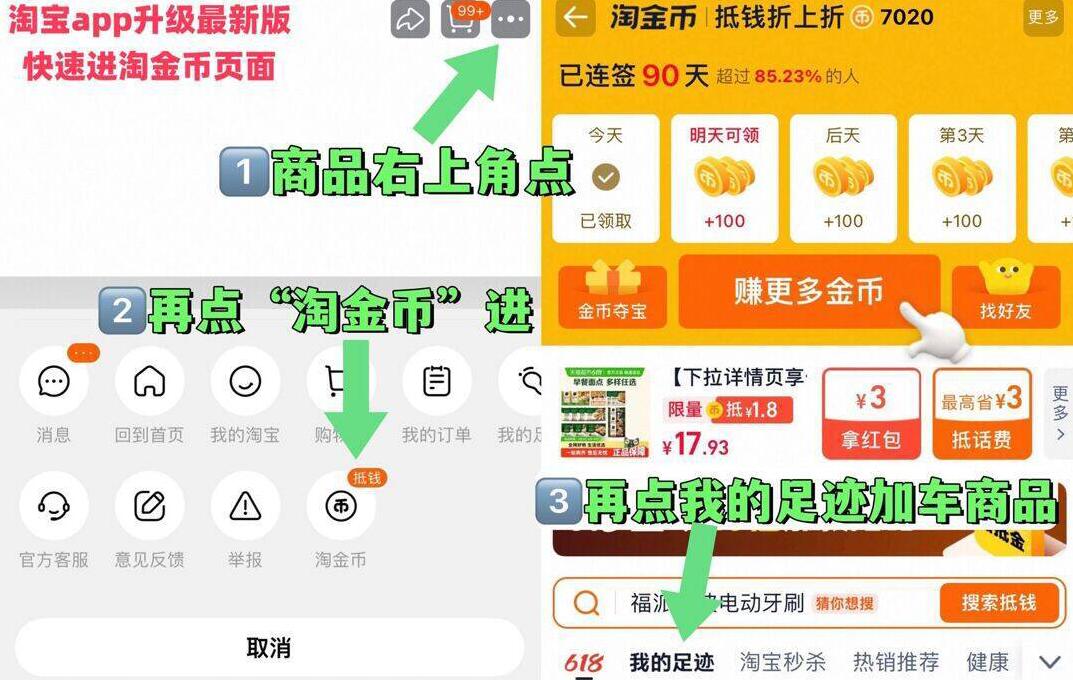 1、如图点右上角3个点选淘金币