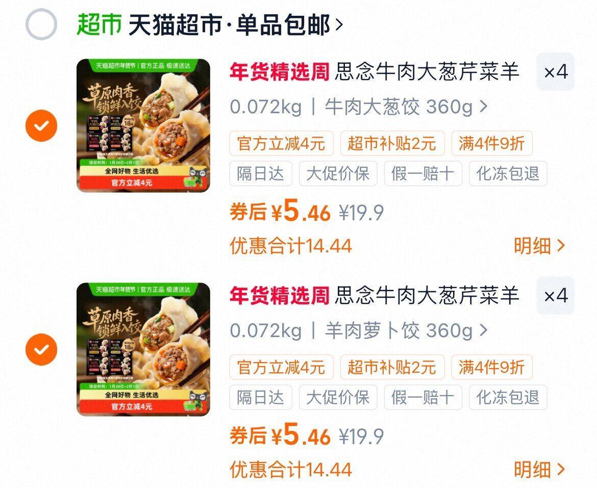 思念 牛肉大葱羊肉水饺共360g*8袋