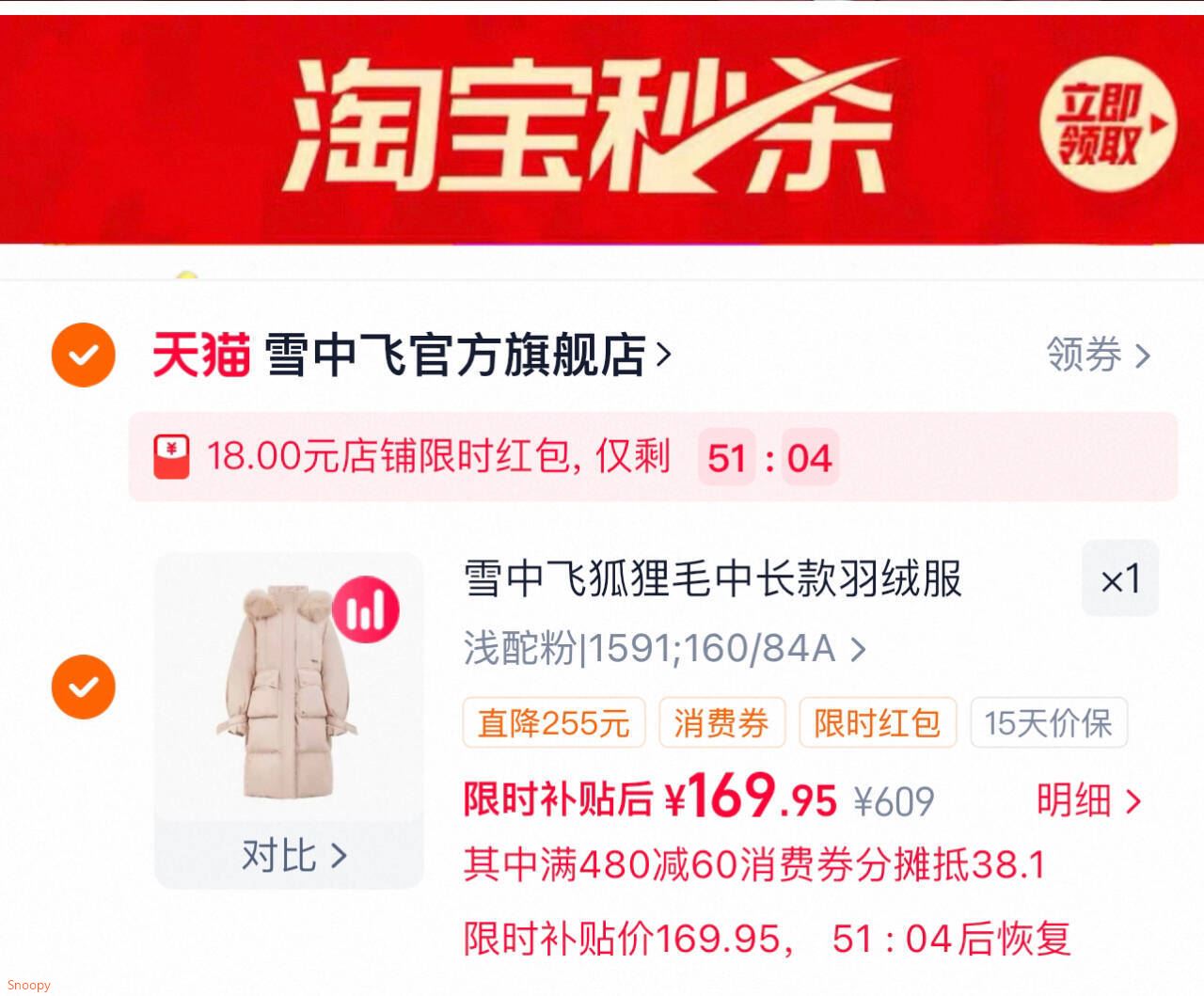 雪中飞 狐狸毛羽绒服加厚长款蝴蝶袖