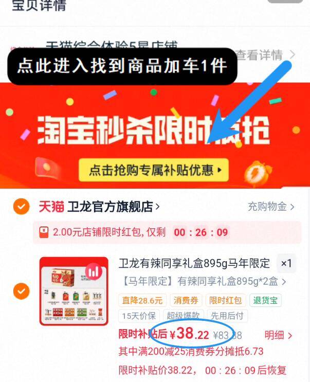 2、下拉详情进秒杀会场加车1件
