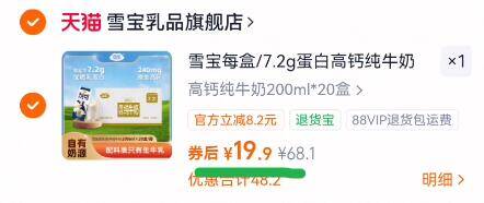 雪宝乳品纯牛奶20盒19.9