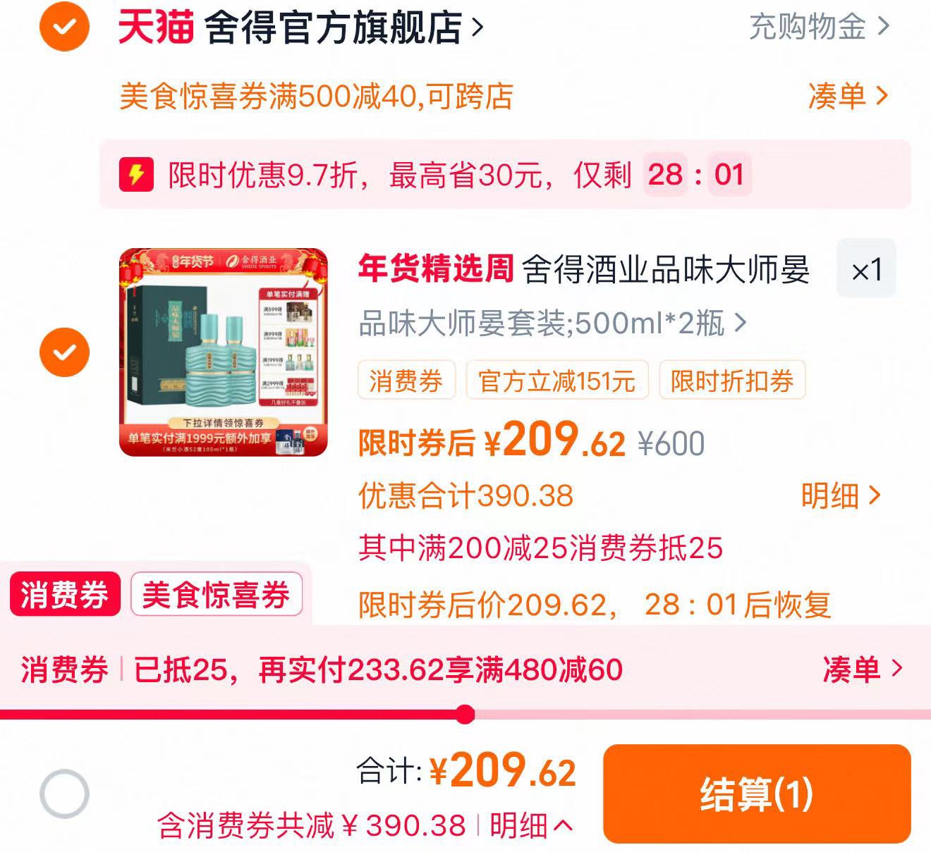 拍下209.6亓 折104.8亓/瓶