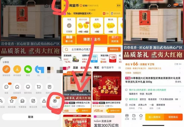 1.商品右上角3个点,选淘金币