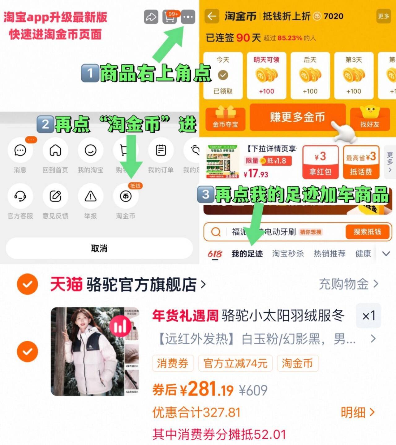 1.领礼金 下拉详情点淘金币