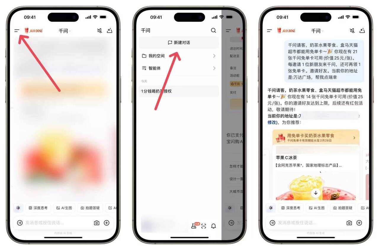 千问请客,奶茶水果零食、盒马天猫超市都能用免单卡~ 你现在有 21 张千问免单卡可用价值25元/张。每邀请 1 位新朋友来千问,还可再领 1 张免单卡。邀请好友。当前你的地址是:xxxxxx点击修改,帮我点xx