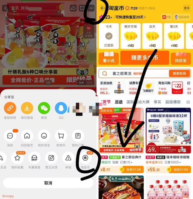 1.商品右上3个点,选淘金币