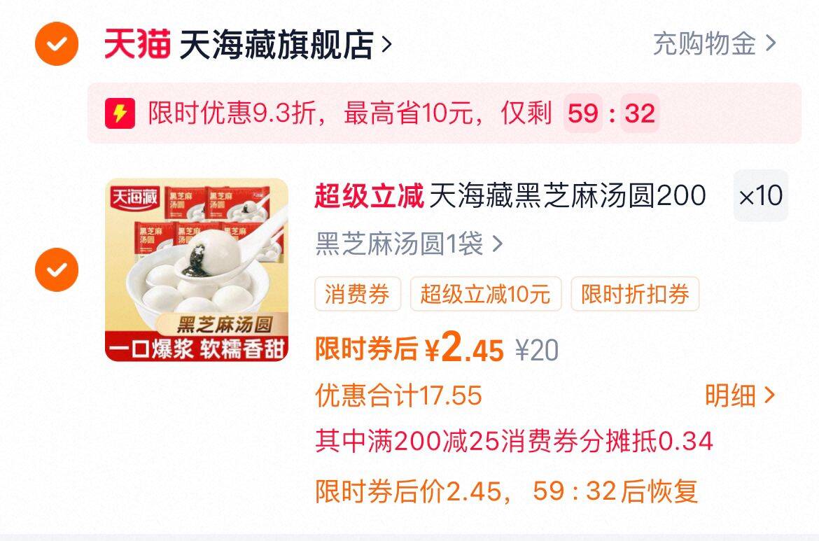 天海藏 黑芝麻汤圆200g*10袋