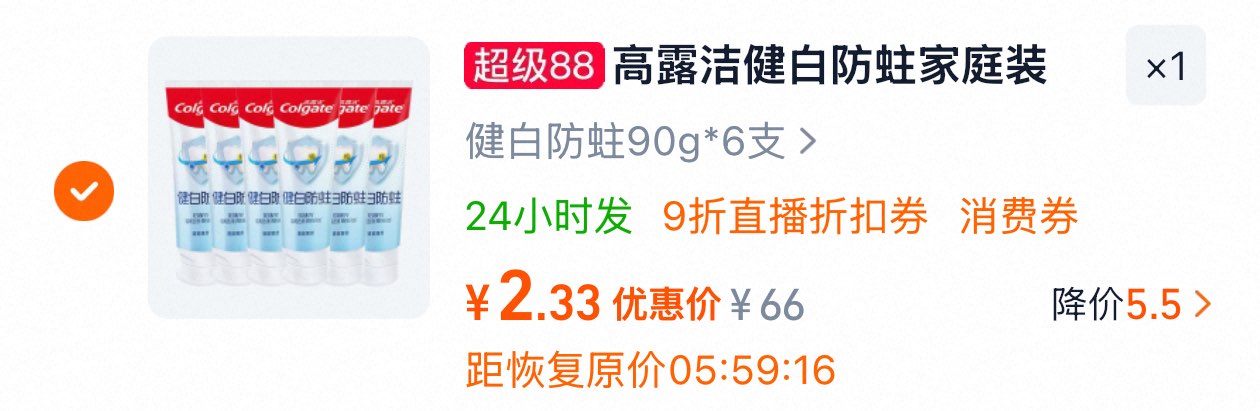 高露洁健白健齿防蛀牙膏90g*6支,领李金