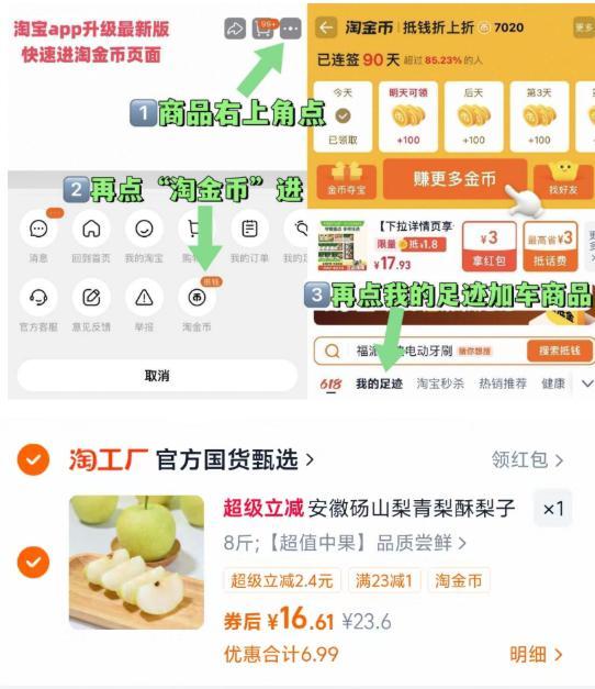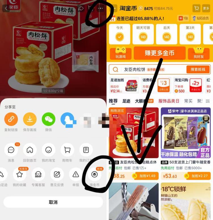 1.商品右上3个点,选淘金币