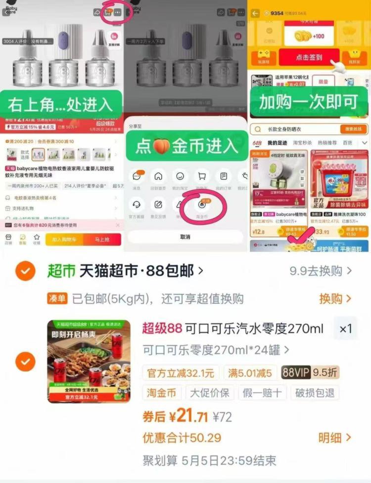 1.商品右上3个点,选淘金币