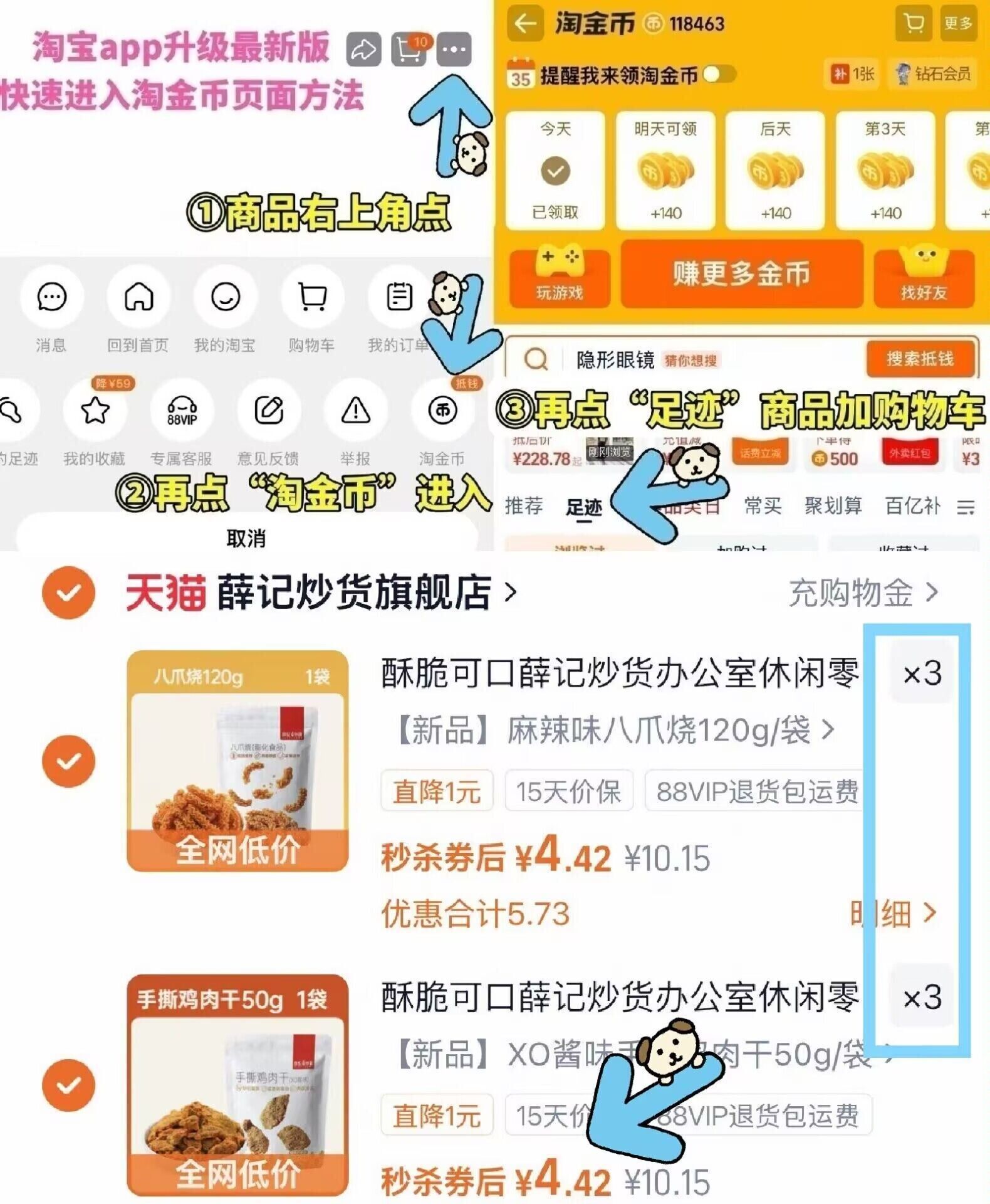①如图点右上角3个点选淘金币