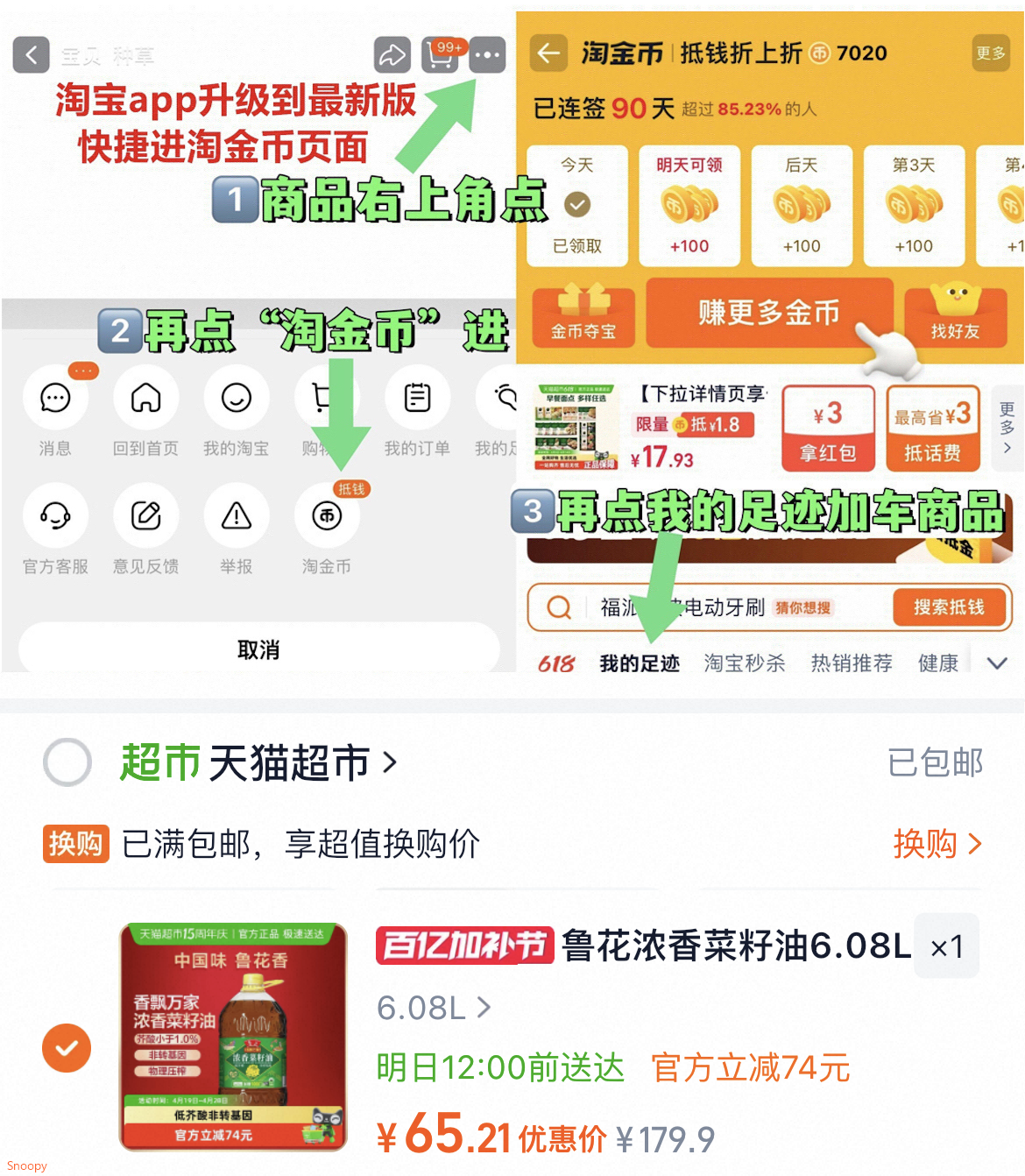 1.下拉详情进淘金币加购1件
